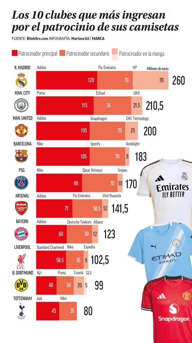 7月16日讯 曼城在昨日签下了一份巨额的球衣主赞助合同,但据《马卡报》报道称,目前全世界球衣年总赞助收入最高的俱乐部依旧是皇马。